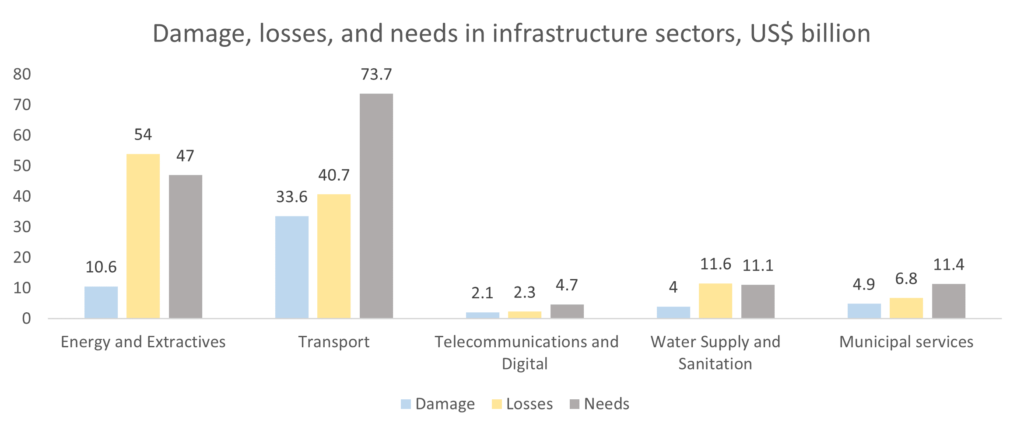 Ukraine has incurred hundreds of billions of US dollars in damage and losses caused by the war. The cost of reconstruction is enormous. The Third Rapid Damage and Needs Assessment sheds the light on the scale of work needed to reconstruct the country. This article focuses on infrastructure as a vital network for the country’s recovery.
