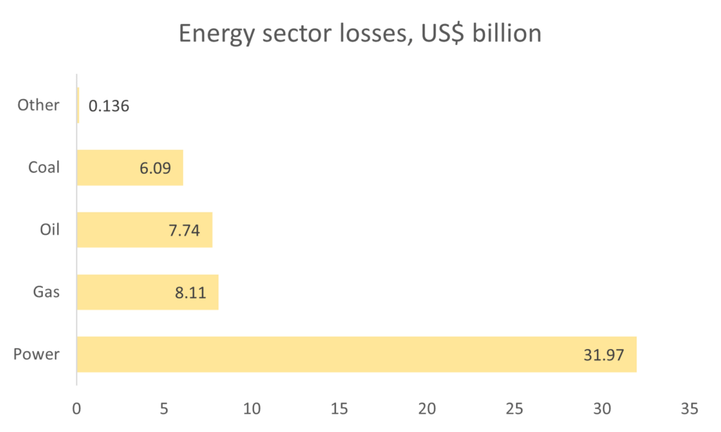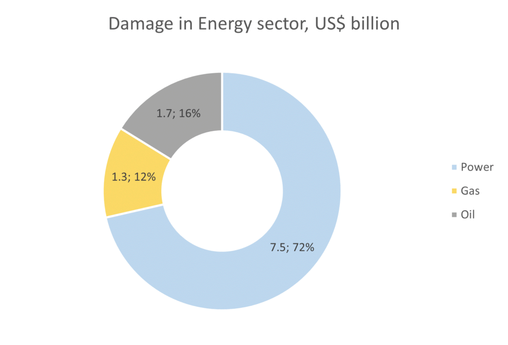 Losses in the energy sector reached US$54 billion, with the power sector being the most affected (59%). The losses mostly represent revenue loss by energy sector operators. This is a consequence of direct damage to the infrastructure and shifts in the country’s demographic landscape, displacement of people, and increased poverty, leading to decreased collection rates.