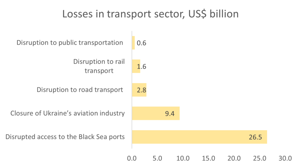Losses in the transport sector are hefty—US$40.7 billion—primarily due to disrupted access to the Black Sea ports (65%) and the closure of the aviation industry (23%). Despite the enormous losses in the transportation industry, several initiatives helped to facilitate transportation and the export industry: the Black Sea Grain Initiative (BSGI) and the EU’s Solidarity Lanes. BSGI alone boosted exports that reached 45 million tonnes per year.