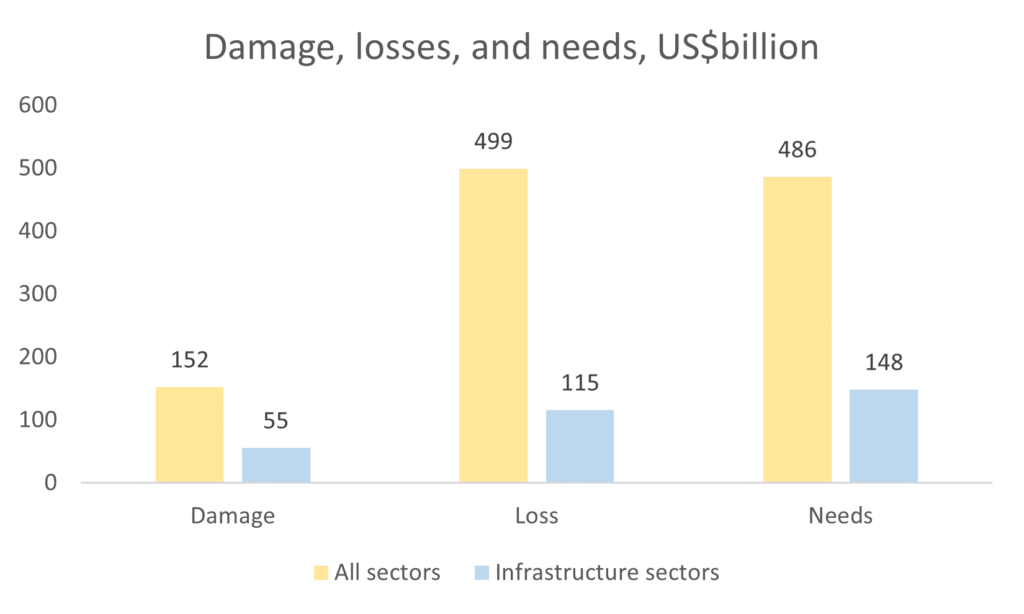 The overall damage is estimated at US$152 billion. This is the direct damage to physical assets from the beginning of the war Russia started against Ukraine in February 2022. The losses, which include indirect damage and associated costs caused by the war, are more than twice as high – US$499 billion. The sectors most profoundly affected include housing, transportation, commerce and industry, agriculture, and energy. To rebuild the damaged assets with a commitment to building back better principles and to facilitate Ukraine’s recovery, an estimated US$486 billion will be needed over ten years.