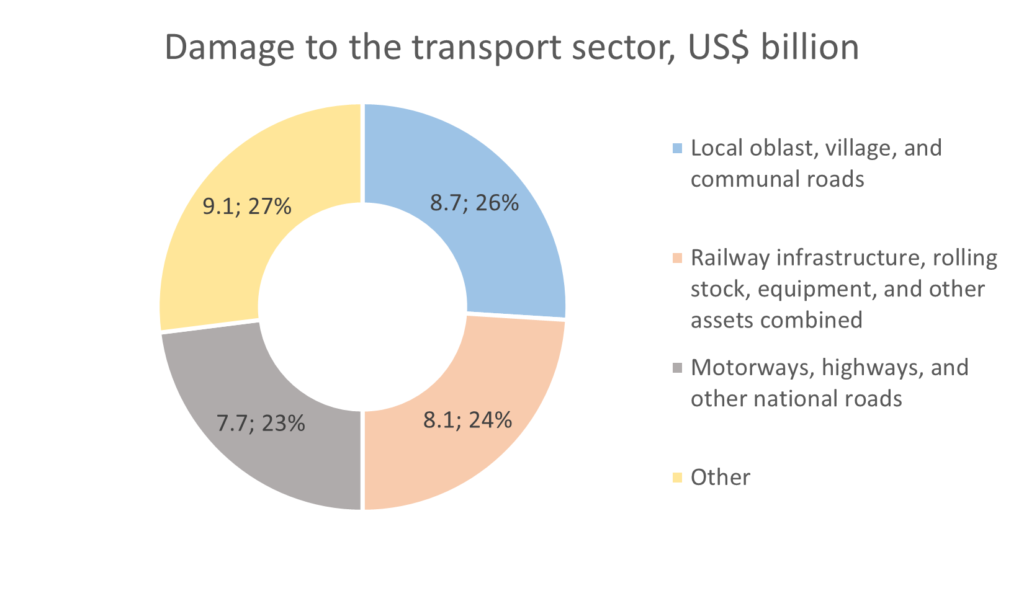 The total damage to the transport sector is estimated at US$33.6 billion. The most impacted type of infrastructure is roads of local importance (26%), followed by railways infrastructure (24%) and national roads (23%). Most of the damage occurred in 2022 when there were significant advances at the frontline and liberation of territories.