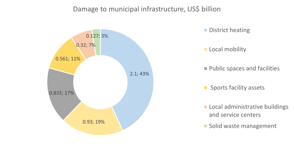 US$11.4 billion is needed to reconstruct the damaged infrastructure over the following ten years. In the short term, debris removal and recovering disrupted municipal services are the main tasks. In the long term, local governments should apply Green Deal principles during asset reconstruction with a strategic approach to making no-regret investments. Specific emphasis is placed on solid waste management and district heating as sectors that needed substantial modernization and improvement even at the pre-war stage.