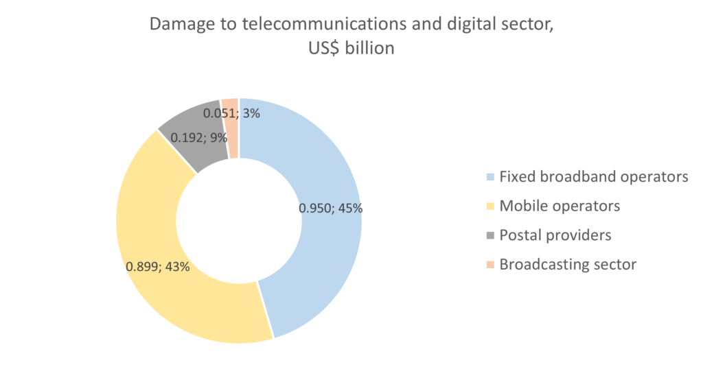 The total damage to the sector is estimated at US$2.1 billion. The fixed broadband and mobile operators were the most affected, with 45% and 43% of the damage, respectively. Postal providers and the broadcasting sector suffered much less, with 9% and 3% of damage, respectively. Except for the eastern and southern regions of the country, the Kyiv area was also one of the most affected.