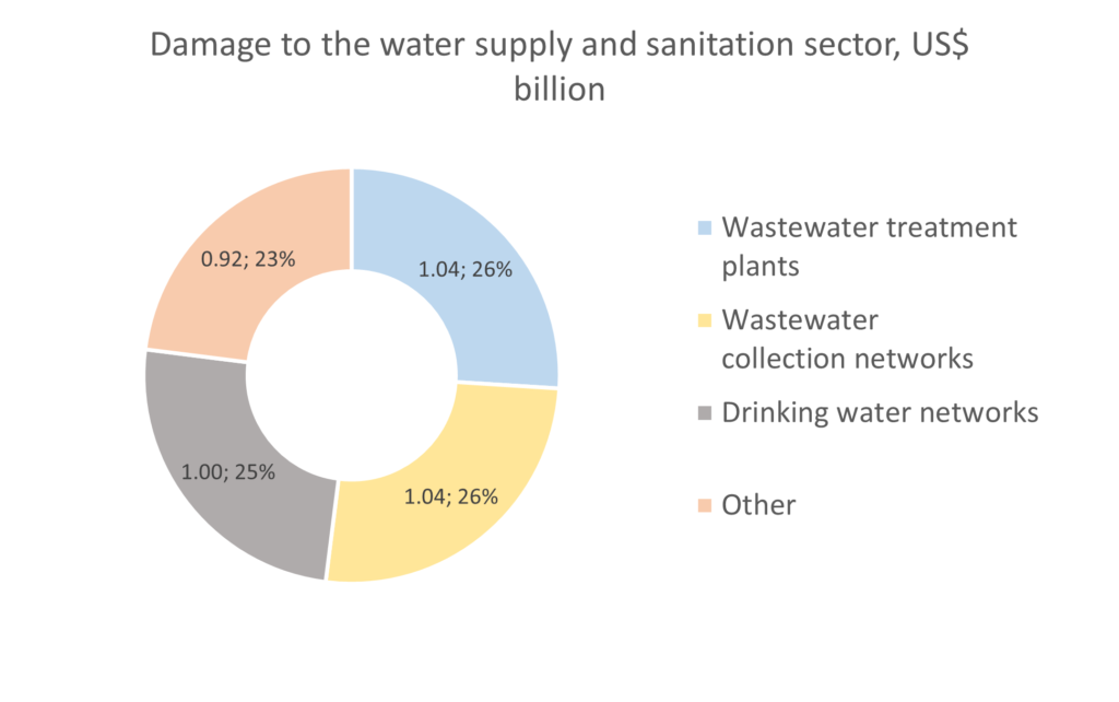 US$4 billion is estimated to be damage to the Water supply and sanitation (WSS) infrastructure caused by the war. The largest part of the damage is associated with the wastewater treatment facilities and drinking water networks.